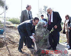 中國國家主席江澤民在以色列總統(tǒng)魏茨曼的陪同下,四月十六日在以色列總統(tǒng)森林園植下了一棵橄欖樹。 中新社記者 彭偉祥 攝