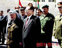 江澤民主席十五日抵達伯利恒對巴勒斯坦進行國事訪問,巴勒斯坦總統(tǒng)阿拉法特舉行歡迎儀式。中新社記者:彭偉祥