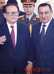 中國國家主席江澤民4月17日抵達(dá)埃及的亞歷山大,與埃及總統(tǒng)穆巴拉克會晤。中新社記者 彭偉祥 攝