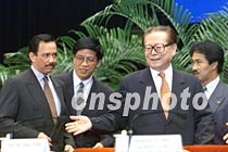 圖文:江澤民會(huì)見文萊蘇丹 2001年5月15日 15:45 ![]() 中國(guó)國(guó)家主席江澤民與文萊蘇丹博爾基亞,十五日在北京人民大會(huì)堂出席APEC人力資源能力建設(shè)高峰會(huì)開幕式。中新社記者 毛建軍 攝