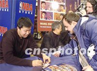 ![]() 今天中午,達(dá)拉斯小牛隊(duì)的高大中鋒王治郅出現(xiàn)在紐約市中心NBA專賣店里。他是第一個(gè)被美國(guó)職業(yè)籃球隊(duì)選中的中國(guó)球員。為表彰他的卓越才華和對(duì)籃球運(yùn)動(dòng)的貢獻(xiàn),一套以他個(gè)人肖像為主題的法定郵票今天開始公開發(fā)售。中新社記者 陳建 攝