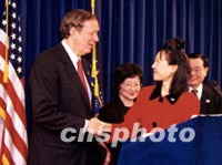 趙小蘭之妹趙小美出任紐約州消費者保護廳長 2002年01月18日 11:15 ![]() 紐約州州長柏德基日前宣布任命華裔趙小美為紐約州消費者保護廳廳長。圖為趙小美(右二)在接受任命后與柏德基州長(左一)握手。右一為趙小美的父親趙錫成,左二為母親朱木蘭。中新社記者 龔文謨 攝