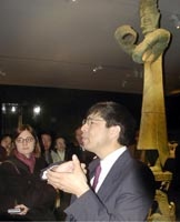 ![]() 紐約大都會博物館亞洲部副主任孫志新博士,向人們解說首次在美國亮相的中國四川三星堆青銅器的特點。他身后的青銅人像全高兩米六,是世界上現(xiàn)存最高的青銅像。銅像兩手一高一低,好像握著什么東西。