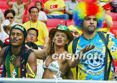 圖:女球迷身穿比基尼觀看巴西與土耳其比賽 2002年06月03日 17:12 6月3日下午,韓日世界杯C組巴西與土耳其隊(duì)的比賽正在韓國(guó)蔚山文竹體育場(chǎng)進(jìn)行。圖為看臺(tái)上身穿比基尼的女球迷。