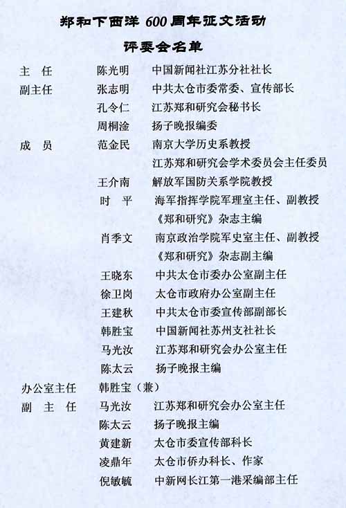 “鄭和下西洋600周年”征文啟示 2002年07月05日 10:36 ![]() 鄭和下西洋600周年征文活動評委會名單 為紀(jì)念鄭和下西洋600周年,弘揚鄭和開放和探險精神,進一步提升鄭和七下西洋起錨地太倉的知名度,促進太倉的兩個文明建設(shè)和經(jīng)濟發(fā)展,特舉行征文活動。 一、征文時間 從2002年7月11日起(鄭和下西洋紀(jì)念日)至2003年7月11日止。 二、征文內(nèi)容 圍繞鄭和七下西洋起錨地太倉與鄭和,從歷史與現(xiàn)實的結(jié)合上,從跨越600年的時間和空間中,從不同視角充分展示鄭和精神及給太倉歷史、經(jīng)濟、文化等方面帶來的影響。 三、征文形式 1、學(xué)術(shù)論文類; 2、文學(xué)類,包括小說、散文、隨筆、詩歌、故事、盈聯(lián)等; 3、新聞類,包括消息、通訊、特寫、專訪、述評等。 四、征文字?jǐn)?shù) 論文一般不超過5000字;文學(xué)作品一般不超過3000字(長、中篇小說例外);新聞一般不超過1500字。 五、征文刊用 征文作品在中新江蘇網(wǎng)、中新網(wǎng)長江第一港、揚子晚報“聚焦蘇錫!睂0、《鄭和研究》雜志刊用。 六、征文評比 征文頒獎活動在2003年9月份舉行,評出論文類、文學(xué)類、新聞類一等獎各一名,獎金3000元;二等獎各三名,獎金1500元;三等獎各五名,獎金500元,另評出榮譽獎若干名。 七、征文請寄江蘇省太倉市體育東路58號,中新網(wǎng)長江第一港編輯部,郵編215400。另電子文檔以word形式保存,寄jiangzhenjiang@chinanews.com.cn作者請自留底稿,所有應(yīng)征作品一律不退稿。 八、本次征文活動解釋權(quán)在征文活動組委會。 主辦單位:太倉市委、市人民政府 中國新聞社江蘇分社 揚子晚報“聚焦蘇錫常”編輯部 江蘇鄭和研究會 二OO二年七月一日