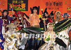 ![]() 歌星梁詠琪23日在香港出席第四屆香港漫畫(huà)節(jié)舉辦之《2002漫畫(huà)人物扮(左口右野)大賽準(zhǔn)決賽》出任嘉賓,賽后與部份入圍決賽的參加者一起合照。鄧慶樂(lè) 攝