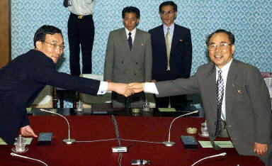 圖:韓國與朝鮮3日在金剛山舉行會談 2002年08月03日 19:44 ![]() 韓國與朝鮮3日下午在朝鮮金剛山旅館舉行了第七次部長級會談預備性接觸的首次全體會議,雙方著重討論了部長級會談在漢城舉行的時間和議題等問題。圖為在金剛山韓國與朝鮮的代表握手。
