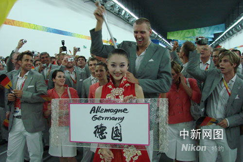 8月8日晚上,唐雯帶領(lǐng)著465名德國(guó)隊(duì)員走入了鳥(niǎo)巢,她舉著牌子,后面緊跟的是德國(guó)隊(duì)的旗手、NBA著名球星諾維斯基……