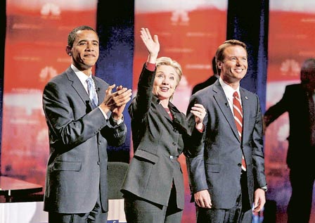 正在沖刺初選的美國前第一夫人希拉里·克林頓在從拉斯維加斯飛往內(nèi)華達(dá)的競選專機上,出人意料地模仿空姐的口吻,對媒體記者和競選幕僚致以調(diào)侃式的問候,向人們展示了“鐵娘子”剛強外表下的幽默風(fēng)趣一面。分析人士指出,希拉里顯然總結(jié)了不久前“眼淚門”的成功經(jīng)驗,繼續(xù)軟化自己的形象,以此拉近與選民的距離。