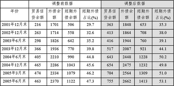 2001-2005年6月末貿(mào)易信貸統(tǒng)計方法調(diào)整前后外債有關指標對比