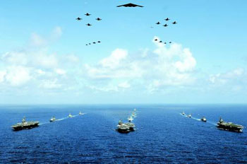 資料圖:亞伯拉罕·林肯號、小鷹號和羅納德·里根號三艘美國海軍航空母艦6月18日排好隊型,在關(guān)島附近的太平洋海上航行