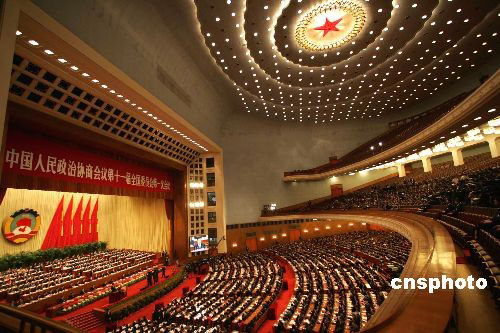三月三日下午,全國政協(xié)十一屆一次會議在北京人民大會堂隆重開幕,胡錦濤等中共黨和國家領(lǐng)導人出席。會議聽取賈慶林作政協(xié)全國委員會常務委員會工作報告。中新社發(fā) 潘索菲 攝