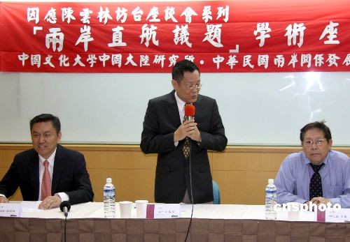 “因應陳云林訪臺座談會系列——兩岸直航議題學術座談會”十七日在臺北舉辦。中國文化大學中國大陸研究所所長邵宗海教授(中立者)邀請“立委”帥化民(右)、前澳門航空公司總經(jīng)理費鴻鈞(左)做演講。中新社發(fā) 耿軍 攝