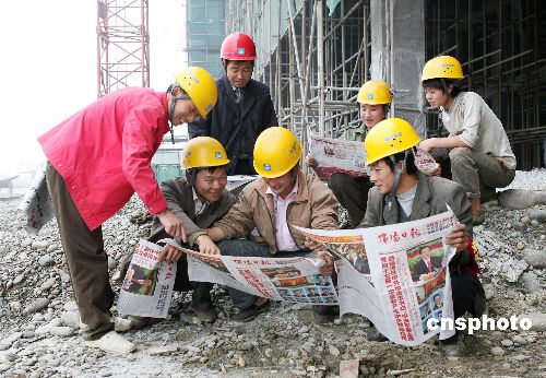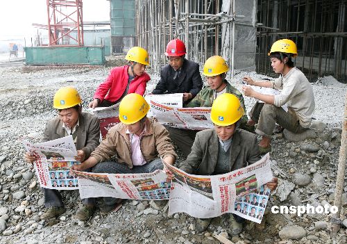 10月23日上午,綿陽長虹工業(yè)園虹歐PDP項(xiàng)目建筑工地,中建公司的農(nóng)民工在閱看《綿陽日報(bào)》有關(guān)十七大的報(bào)道。他們看到十七大報(bào)告中關(guān)于完善和落實(shí)國家對農(nóng)民工的政策,依法維護(hù)勞動(dòng)者權(quán)益等內(nèi)容后喜笑顏開,表示將安全生產(chǎn),把工程項(xiàng)目盡快完成,為祖國建設(shè)貢獻(xiàn)自己的力量。中新社發(fā) 蒲滔 攝