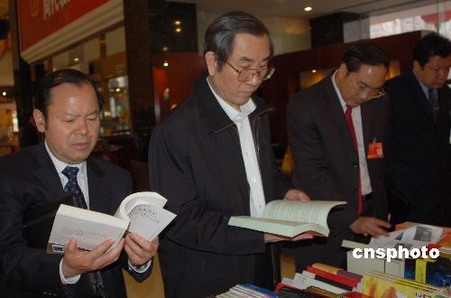 3月8日下午,參加完十一屆全國人大一次會議第二次全體會議的全國人大代表、廣西壯族自治區(qū)主席馬飚(左二)等人,在廣西大廈內的書攤前選購圖書,會議間隙學習“充電”。中新社發(fā) 劉萬強 攝