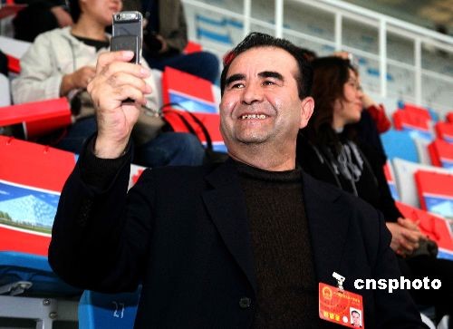 在國家游泳館,來自新疆代表團的努爾拉·阿尤甫代表在用手機拍攝“水立方”場內(nèi)景。