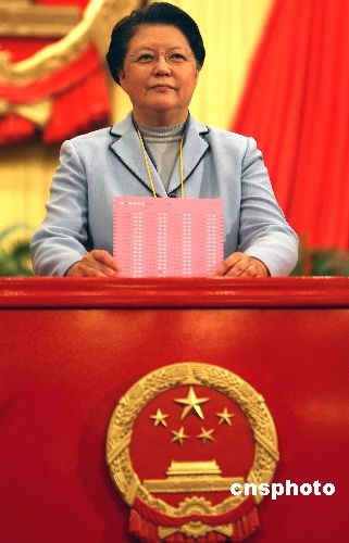 三月十五日上午,十一屆全國人大一次會議第五次全體會議在北京人民大會堂舉行,表決關于批準國務院機構改革方案的決定草案,選舉十一屆全國人大常委會委員長、副委員長、秘書長和常委,選舉國家主席、副主席及中央軍委主席等。圖為當選為十一屆全國人大常委會常委的香港全國人大代表范徐麗泰在會場投票。中新社發(fā) 任晨鳴 攝
