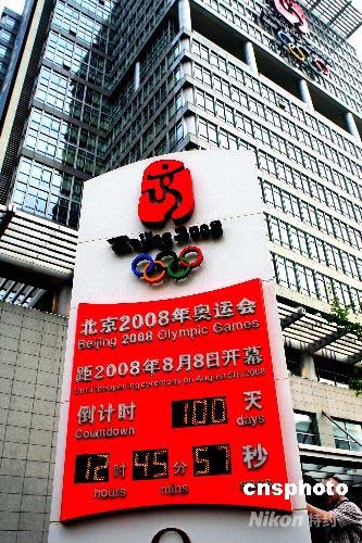 4月30日上午,顯示距北京2008年奧運(yùn)會(huì)100天的北京奧運(yùn)大廈倒計(jì)時(shí)牌吸引記者拍攝。當(dāng)日京城隆重舉行系;顒(dòng),表達(dá)京城各界人士盼望北京奧運(yùn)會(huì)的喜悅心情。 中新社發(fā) 宋吉河 攝