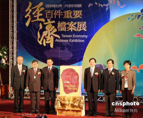 十月五日,《百件經(jīng)濟(jì)重要檔案展》在臺北中山南路二十號的圖書館開幕。展出的一百一十一則檔案,是從近六百萬件檔案中嚴(yán)選、再經(jīng)六位專家學(xué)者審定才展示給觀眾的。圖為展覽開幕式。中新社發(fā) 耿軍 攝
