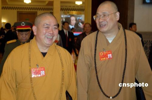 3月10日上午,十一屆全國人大一次會議在北京人民大會堂舉行第三次全體會議,中國佛教協(xié)會副會長、河南省佛教協(xié)會會長、河南省少林寺方丈釋永信(左),中國佛教協(xié)會常務(wù)副會長、湖南省佛教協(xié)會會長釋圣輝共同出席。中新社發(fā) 劉萬強 攝
