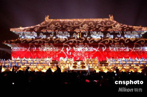 4月30日,北京2008年奧運會倒計時100天慶;顒郁叩谒膶帽本⿰W運歌曲評選活動頒獎晚會在北京勞動人民文化宮太廟舉行,莊嚴(yán)的太廟披上節(jié)日盛裝。中新社發(fā) 趙振清 攝