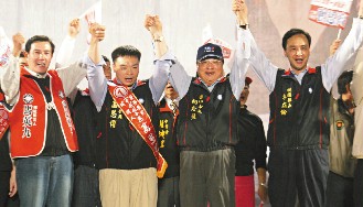 國(guó)民黨2008參選人馬英九(左一)與臺(tái)中市長(zhǎng)胡志強(qiáng)(右二)、桃園縣長(zhǎng)朱立倫(右)昨晚到臺(tái)南,幫“立委”候選人高思博(左二)站臺(tái)。(圖:臺(tái)灣《聯(lián)合報(bào)》)