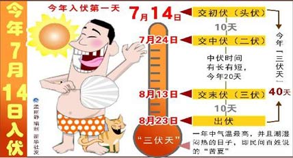 三伏天是按照我國(guó)古代的“干支紀(jì)日法”確定的。每年夏至以后第三個(gè)庚日(指干支紀(jì)日中帶有“庚”字的日子)為初伏,第四個(gè)庚日為中伏,立秋后第一個(gè)庚日為末伏,合起來(lái)稱(chēng)為三伏。按陽(yáng)歷計(jì)算則出現(xiàn)在7月中旬到8月中旬。此時(shí)我國(guó)大部地區(qū)是一年中最熱的時(shí)節(jié)……