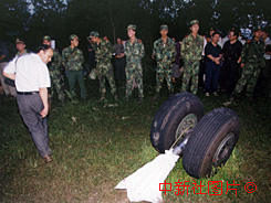 武警封鎖的墜機(jī)現(xiàn)場(chǎng),和墜機(jī)的起落架。東方 攝