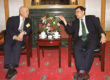 遼寧省委副書記張行湘八月五日晚在沈陽市遼寧賓館會見了臺灣“促進中國現(xiàn)代化學術研究基金會”董事長王升(左)夫婦及其隨行人員,并一起共進了晚餐。中新社記者 趙振清 攝