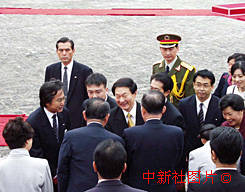 日本首相森喜朗今天在日本東京迎賓館舉行隆重的歡迎儀式,歡迎中國(guó)總理朱镕基總理訪日。圖為朱镕基在森喜朗首相陪同下檢閱儀仗隊(duì)后與出席歡迎儀式的日方官員握手。中新社記者:王曉暉