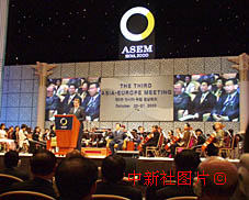亞歐會議閉幕式,中國總理朱镕基的形象出現在主席臺的的屏幕上。中新社記者:王曉暉 攝