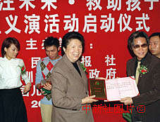 香港演藝界明星許志安、蘇永康、容祖兒,二十六日在北京人民大會堂中國兒童少年安康成長計劃工作委員會成立暨“關(guān)注未來·救助孩子”大型義演活動啟動儀式上捐贈簽名光盤,并被授予愛心大使稱號。中新社記者 李剛 攝