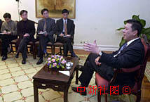 圖文:何厚鏵接受內(nèi)地傳媒集體采訪2 2000年12月14日 14:34 ![]() 在澳門回歸祖國一周年之際,行政長官何厚鏵十三日在禮賓府接受內(nèi)地傳媒集體采訪。中新社傳真 宗金柱攝