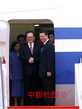 首次進(jìn)京述職的澳門特別行政長(zhǎng)官何厚鏵陪同國(guó)家主席江澤民乘專機(jī)19日抵達(dá)澳門。中新社傳真 滿會(huì)喬攝