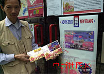 圖文:澳門郵政局20日發(fā)行澳門特區(qū)成立一周年紀(jì)念郵票 2000年12月20日 13:51 ![]() 澳門郵政局20日發(fā)行澳門特區(qū)成立一周年紀(jì)念郵票,專門從香港乘早班船到澳門訂購(gòu)郵票的朱炳然先生高興的展示排隊(duì)選購(gòu)到的紀(jì)念郵票。中新社傳真洪少葵攝