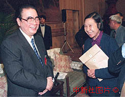 李鵬參加小組討論時和著名兒科專家胡亞美交談 2000年3月6日 08:45 ![]()