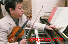 中國國家交響樂團(tuán)著名小提琴演奏家盛中國,近日將開始新千年全國巡回演出。圖為盛中國在家中研究樂譜。中新社記者 張勤 攝
