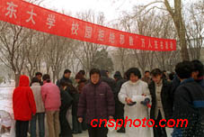 近日山東大學師生冒著嚴寒在校園舉行“校園拒絕邪教”萬人簽名活動。中新社傳真 荊強攝