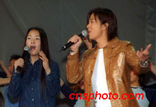 歌星田震(左)二月二十日在香港舉行的“向老師致敬2001”活動(dòng)上演唱。中新社傳真 任海霞攝