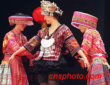 中國新絲路模特赴德國表演團(tuán),二十二日在北京嘉里中心飯店舉行專場(chǎng)展示。圖為模特展示中國歷代少數(shù)民族服飾作品。中新社圖 東方 攝