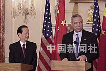 美東時(shí)間二十一日晚,中國國務(wù)院副總理錢其琛與美國國務(wù)卿鮑威爾,在美國國務(wù)院大樓舉行會談前會見記者,雙方希望繼續(xù)推進(jìn)中美兩國關(guān)系向前發(fā)展。中新社圖 京華 攝