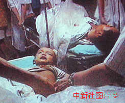 四川農民、“法輪功”修煉者湯志華迷信所謂“世界末日”的說教,1999年8月11日凌晨3點多鐘,竟用菜刀將其兩歲多的兒子的生殖器割下,然后又自殘。經醫(yī)院搶救,湯志華父子的病情已基本穩(wěn)定。圖為搶救手術現(xiàn)場。