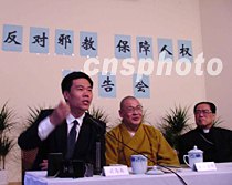 圖文:中國反邪教協(xié)會代表團訪法 2001年3月29日 10:30 ![]() 圖為:圖為司馬南在作報告 中新社傳真 蔚中攝 中國反邪教協(xié)會代表團三月二十四日下午在巴黎作“反對邪教保障人權(quán)”專題報告會,揭露“法輪功”反人權(quán)、反社會、反科學的邪惡本質(zhì),受到中國旅法留學生的歡迎。 中國反邪教協(xié)會代表團由中國天主教愛國會主席、中國反邪教協(xié)會副理事長傅鐵山主教,中國佛教協(xié)會副會長、中國反邪教協(xié)會副理事長圣輝法師,中國反邪教代表團團長、中國科技館館長王渝生教授和中國反邪教協(xié)會理事、中國科普作家協(xié)會副理事長司馬南等組成。 |