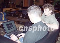 四月三日夜間至四日凌晨,?谖娜A大酒店中外記者云集,準(zhǔn)備采訪美國駐華使館預(yù)定在這里舉行爾后取消的記者招待會。圖為兩名美聯(lián)社記者在現(xiàn)場用電腦發(fā)稿。中新社記者 莫成雄 攝