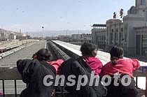 來自拉薩的藏族婦女在西寧火車站天橋上觀看即將出發(fā)的列車,盼望抵達(dá)拉薩的青藏鐵路早日建成。青海省西寧火車站是未來青藏鐵路的起點(diǎn)。中新社記者 毛建軍 攝