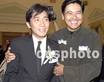 香港影視巨星周潤發(fā)4月11日在香港禮賓府出席表彰香港杰出電影工作者酒會,并耐心等待獲表彰的梁朝偉接受完記者采訪后熱情向梁朝偉祝賀。中新社傳真任晨鳴攝
