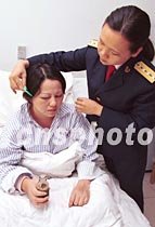 英雄飛行員王偉犧牲后,他的妻子阮國(guó)琴一直沉浸在巨大悲痛之中,茶飯不思,每天需服用藥物才能入睡。圖為四月十八日上午,工作人員在北京某醫(yī)院護(hù)理身體虛弱的阮國(guó)琴。中新社圖 張全躍 攝