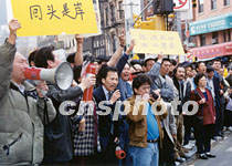 紐約華人社團(tuán)聯(lián)合會等僑團(tuán)二十一日在華埠鬧市的六個地段向行人講解“法輪功”的危害。聯(lián)合總會主席梁冠軍(左四)用麥克風(fēng)向“法輪功”信徒呼吁珍惜自己和家人的生命,不要再受李宏志的蒙騙。中新社圖 郭健 攝