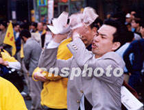 紐約華埠一景:怒撕“法輪功”小冊(cè)子 2001年4月22日 18:56 ![]()