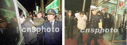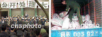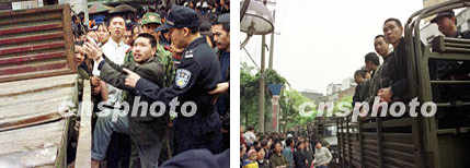 新聞組圖:中國各地嚴(yán)打行動 2001年4月25日 10:04 ![]() 圖(1) 圖(2) ![]() 圖(3) 圖(4) ![]() 圖(5) 圖(6) 圖(1)說明:北京西城公安分局、工商局日前聯(lián)合在夜間清理音像市場,當(dāng)場抓獲販賣盜版光盤人員十余名。中新社記者宋吉河攝 圖(2)說明:北京公安西城公安分局日前夜間收容外地進(jìn)京“三無”人員,全面整頓社會治安。中新社記者宋吉河攝 圖(3)說明:重慶市巴南區(qū)二十四日在電影院廣場前公開審判十九名刑事犯罪分子,上千名當(dāng)?shù)厝罕妳⒓恿舜髸,無不拍手稱快。中新社記者趙振清攝 圖(4)說明:福清市公安邊防大隊官兵,23日凌晨在“治爆緝槍專項行動”中,先后破獲二起特大偷運、私藏炸藥案,共查獲土制銨油炸藥5000多公斤、雷管283枚、導(dǎo)火索250米。圖為一名邊防警員在福清?阪(zhèn)方新村官下尾路段攔檢一輛裝載有土制銨油炸藥的可疑貨車。中新社圖賀錕陳暉攝 圖(5)說明:中國重慶市巴南區(qū)二十四日在該區(qū)電影院廣場前公開審判十九名刑事犯罪分子,當(dāng)?shù)厣锨忻駠^犯罪分子被押上刑車,送往監(jiān)獄的過程。中新社記者趙振清攝 圖(6)說明:中國重慶市巴南區(qū)二十四日在該區(qū)影院廣場公開審判十九名刑事犯罪分子,當(dāng)?shù)厍忻瘳F(xiàn)場目睹犯罪分子被押上刑車,送往監(jiān)獄的過程。中新社記者趙振清攝 |
